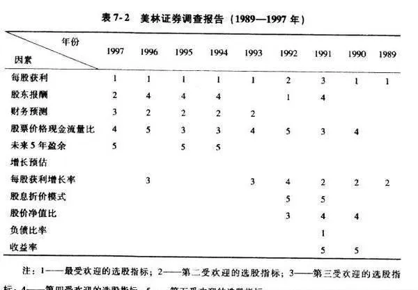 美林证券的这个项目调查非常符合亚瑟所说的指标生态学的内容,在过去几年里,我们不断地看到有些选股指标风光不再,而有些指标则越来越受到人们的青睐。