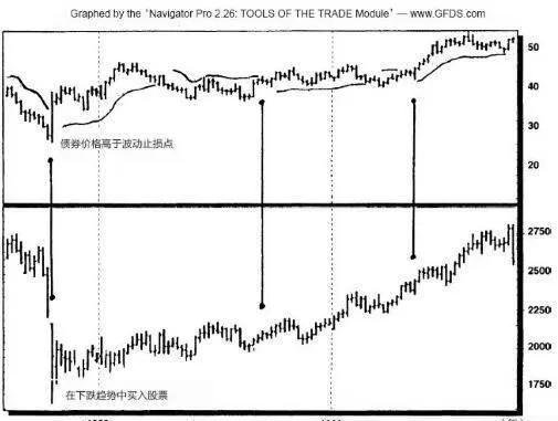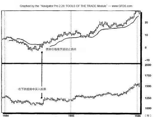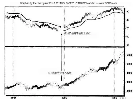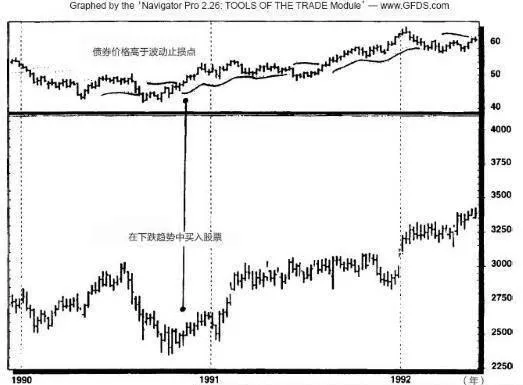 图4-7展示了债券市场周线的波动止损的差值。我们的交易规则是要在债券市场收盘价高于波动止损点时,寻找买进股票的时机。这种情形应该出现在股票已经下跌一段时间,或是在熊市已经确立的时候。我们现在利用债券价格趋势作为购买股票的指引。债券价格周收盘价超过波动止损,代表购买股票的时机出现。