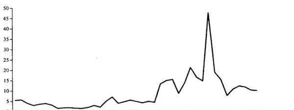 谢正彦和沃克林把全部股票中排在前10%的股票定义为概念股。图23-1为美股市销率最高10%股票的平均市销率(我们已经根据截至1999年的数据对谢正彦和沃克林的结论进行了更新)。网络股的疯狂,更是把概念股的火爆推到了极致,这些股票的市销率竟然一度接近48倍!而目前超过10倍的市销率同样值得注意—这不免会让我们重新想起麦克尼利上面的那段话。在全部样本中,平均市价对销售额的平均比率还不到9倍。但这与泡沫时期还不完全一样。如果选取1967年到1995年的样本,平均市销率却仅在5.5倍左右。