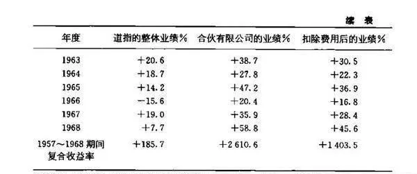 巴菲特的业绩远远超过额外的1%,他实现的年均收益率达31.6%扣除基金管理费用后,投资者(“有限合伙”)获得的收益按年率计算为25.3%从这些数字来看,如果你在1957年底对道琼斯指数投资了1000美元,那么到1968年底你将获得2857美元(不含税)。而将1000美元投入到巴菲特合伙有限公司那么在扣除巴菲特手续费之前将获得27106美元(费用开支后),或扣除巴菲特手续费之后获得15035美元。
