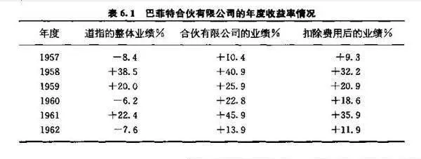 沃伦·巴菲特于1957年开始基金管理业务,他邀请人们把钱投入他的手中,目的是战胜三年期的道琼斯工业平均指数(按照巴菲特的理论,三年是基金管理人业绩评判的最短时间长度),如表6.1所示,他做得比道琼斯工业平均指数更好,巴菲特合伙有限公司每年的业绩均优于道指在这12年的时间内,道琼斯指数的年均复合收益率是9.1%.而多数客户对基金管理人能实现每年超过指数仅仅1个百分点即感到满意但这不足以作为基金管理人最好的业绩。