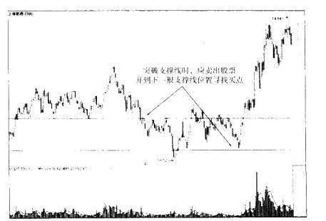 5.当股价在支撑线上方向下突破支撑线时,应卖出股票,并到下一根支撑线位置寻找买点(见图8-15)。