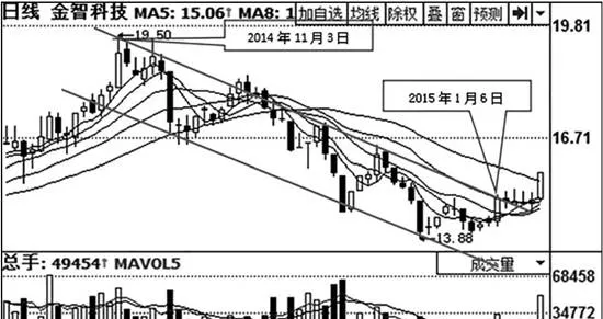 2015年1月6日,该股股价低开高走,收出一根大阳线,且这根大阳线一举突破了金智科技股价运行的下降通道。这说明股价短期内将启动一波上涨行情。
