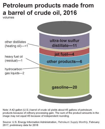 根据美国能源信息署 (EIA)的数据,美国炼油厂每桶 42 加仑的原油可生产出 19 至 20 加仑的车用汽油、11 至 12 加仑的馏分燃料(其中大部分以柴油的形式出售)以及 4 加仑的航空燃料。炼油厂还生产十几种其他石油产品。石油炼油厂生产的液体被石化行业用来制造各种化学品和塑料。