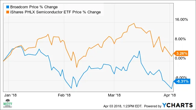 今年以来,博通(Broadcom)的股价表现远逊于iShares PHLX半导体ETF ( SOXX ),这家芯片制造商的股价下跌了近8.3%,而该半导体ETF则上涨了近3.5%。这种明显的背离表明,这家曾在2017年股价飙升45%的股市宠儿,如今已不再受投资者青睐。