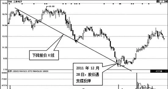 如上图所示,三泰电子(002312)。三泰电子的股价从2011年7月15日开始走出了一波下跌行情,股价的下跌走势可以制出一条下降股价X线。