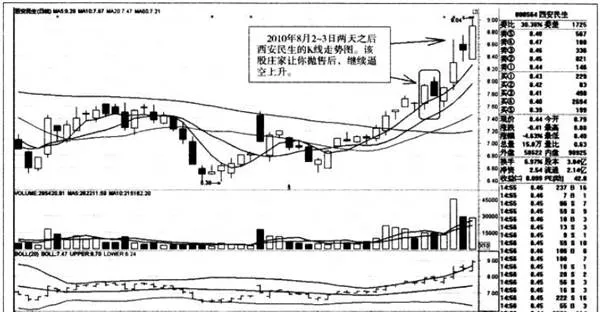 上图为2010年8月2-3日两天之后西安民生的K线走势图。该股庄家让你抛售后,继续逼空上升。所以。我们在审阅实战图形时,最好能够多留一个心眼,再配合当时的大市气氛和个股的热点来进行综合判断,才会较为准确。