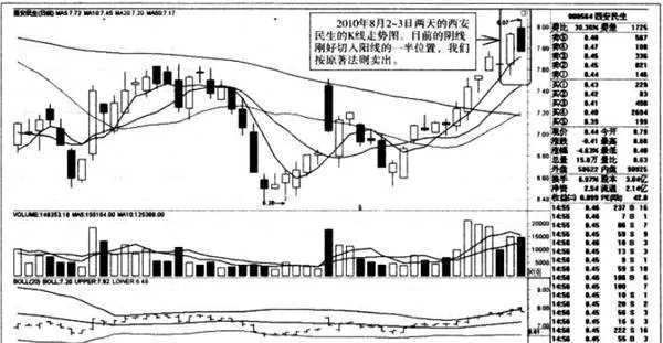 上图为2010年8月2-3日两天的西安民生的K线走势图。目前的阴线刚好切入阳线的一半位置,我们按原著法则卖出,其结果将会如何呢?我们可以通过该股的后市发展来进行跟踪研究。