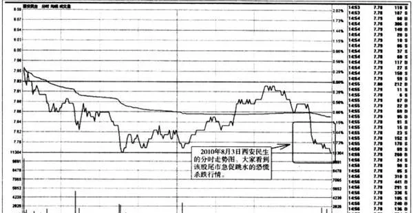 上图为2010年8月3日西安民生的分时走势图。大家看到该股尾市急促跳水的恐慌杀跌行情。按理这时卖出股票是正确了吧?谁知道庄家偏要说不!