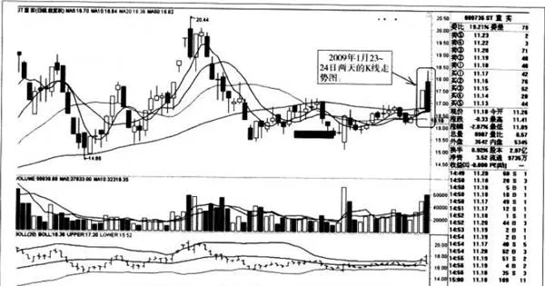 上图为2009年11月23-24日两天的ST重实的K线走势图。盘中抛盘较多,加上股价刚好受制于布林通道上轨,下跌得到技术指标的印证,投资者此时卖出是明智之举。
