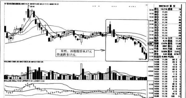 上图为2009年11月24日至12月22日ST重实的K线走势图,该股股价从17元快速跌至13元,短期跌幅惊人。