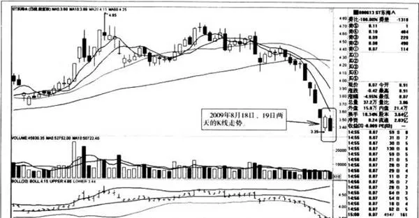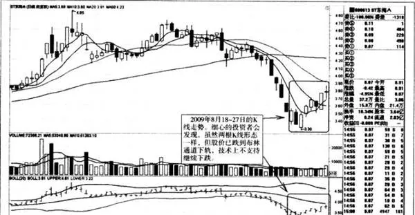 上图为2009年8月18 --27日ST东海的K线走势。细心的投资者会发现,虽然两根K线形态一样,但股价已跌到布林通道下轨,技术上不支持股价继续下跌,因此,投资者在此时卖出是错误的。