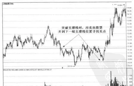 2.股价在支撑线上方向下突破支撑线时,应卖出股票,并到下一根支撑线位置寻找买点。