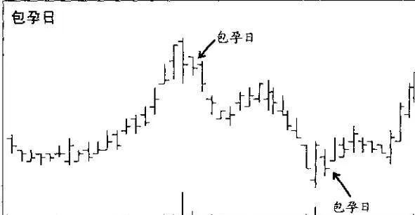 包孕日出现在价格短期持续上涨后,实际上,包孕日是双日反转的第二天(示意图6-9)。在上行趋势中,第一天是一个陡峭的上行浪。第二天的价格波动范围完全被前一天的价格波动范围所覆盖。一般说来,覆盖得越紧越好。第二天实际上告诉我们买方人气已经不足,上行动力已经衰竭。