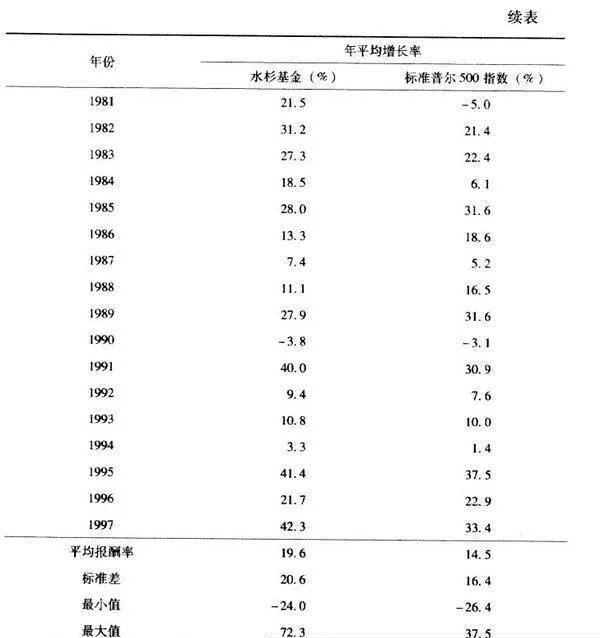 表3-4是水杉基金1971~1997年间的操作记录,在这段时间内,水杉基金的年平均报酬率高达19.6%,同期标准普尔500股票价格指数的涨幅仅为14.5%。和其他价值投资组合一样,水杉基金的报酬率也曾经历过一段颠簸震藹的过程。这段期间内整体股市成长率的标准差是16.4%,而水杉基金的报酬率标准差却达20.6%。这样的标准差会让人觉得水杉基金投资组合的风险很高。但鲁安和坎利夫在选股上所花的精力足以降低任何风险,从中也再次证明,传统的风险组合观念是不能用来衡量水杉基金的风险的。