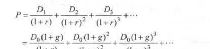 其中,D。为当前现金流,D为在Do基础上以固定比例(1+g)增长的未来第一.期现金流,D2. D3依次在前一期基础上以(1+g)速度增长,依此类推。 通过数学上的等比数列推导,常数增长模型又可写成: