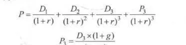 其中,D、D2. D3为高增长第一阶段各期的现金流,P3为在D3基础上以固定常数增长各期的现金流贴现回第三年时的现值,还需继续除以(1+r)才能贴现问最初的现值。
