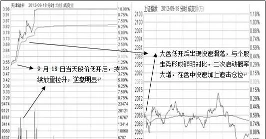 因此可在该股靠近均线的时候先小仓位吃进一部分,但该股在经历短短的两天整理后便快速进入到了再次拉升,第三天就继续封板。但好在第三天该股是低开,且幅度较大,开盘后快速拉升。与同期的大盘表现形成鲜明的对比,说明主力已经按耐不住了,出现了明显的逆盘走势(如下图所示),于是可在盘中快速打进追击仓,完成建仓工作。