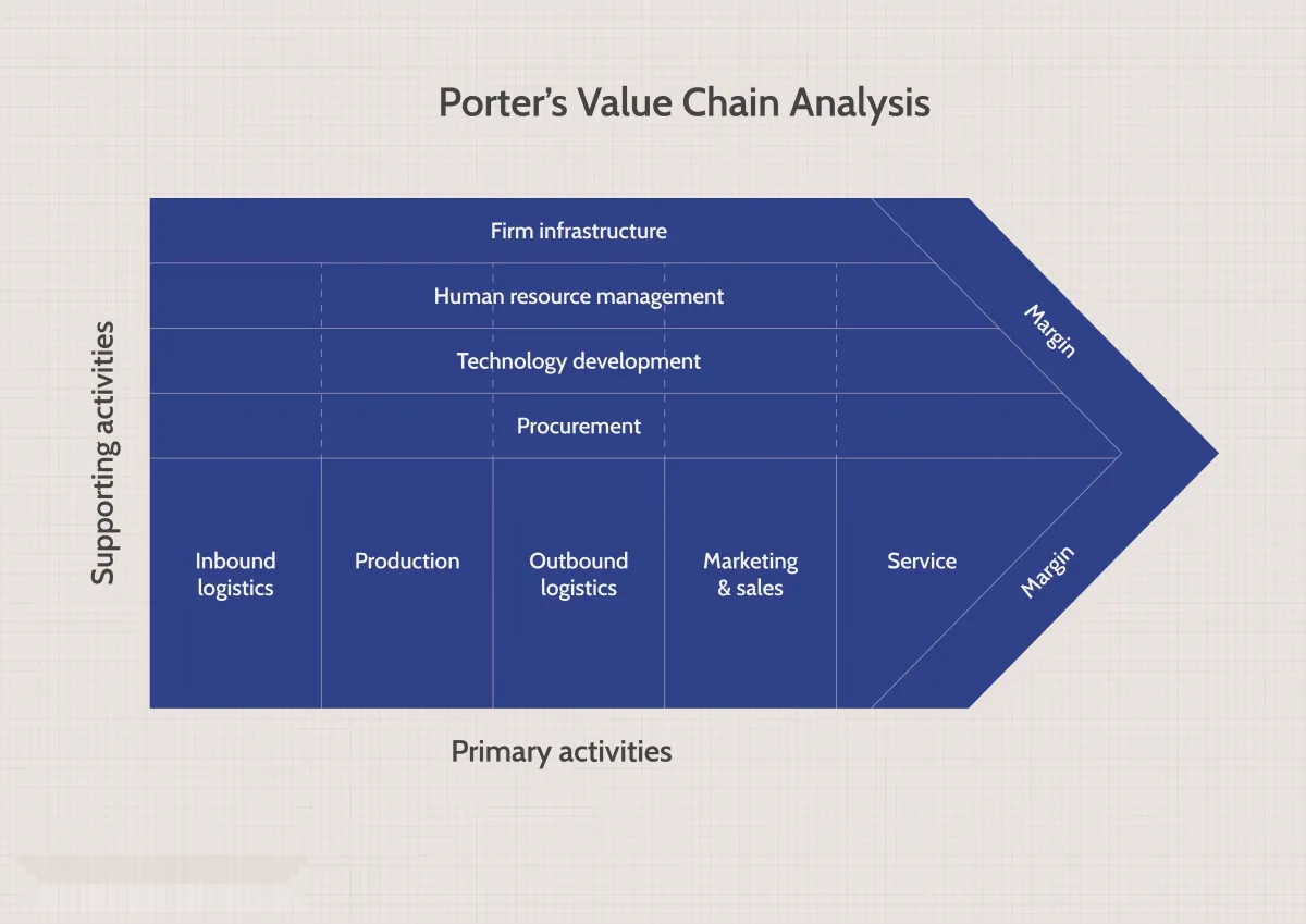 迈克尔·波特对价值链的分析提供了以下可视化辅助学习工具。