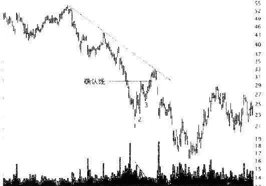 图6.8 这个3RV图形没有穿过趋势线阻力区,价格耽产生了反转。进免类似情形发生,用1-2-3趋势改变法则来检验。注意图中逐渐下降的成交I量趋势。