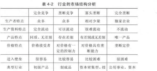 如果外部的需求无法改变,对于商家而言,就只能控制供给,而想要控制供给,就需要良好的产业结构,供给不会轻易增加,行业保持超额收益的时间就更长。行业结构是指主营品种和范围基本相同的企业群体的数量及其构成比例。在某一市场中,商家的数量越少,市场份额越集中,供给就越容易控制,我们按商家数量的多少和行业的集中度,划分了四种市场类型,完全竞争、垄断竞争、寡头竞争、完全垄断,如表4-2所示。