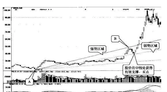 当股价运行在上涨行情中,通过起涨点和波段高点,可以画出上升速阻线。在随后的股价运行中,上升速阻线的中线和下轨线都将对股价形成强有力的支撑。