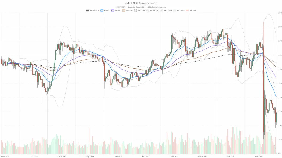 XMR 目前的交易价格远低于所有三条 EMA 均线。短期趋势线(20 日均线)低于中期和长期均线(50 日均线和 200 日均线),而价格甚至进一步低于这三条均线的总和。这是典型的熊市行为:从统计学角度来看,反弹更有可能被抛售,直到价格至少能够重新站上 20 日均线并保持在其上方。