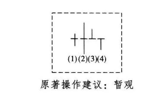 开盘、收盘均在同一价位上,但上下方各冒出长短不同的影线,(1)一(4)的名称分别为:十字星、长十字星、倒T字线、T字线,十字星和T字线、倒T字线皆为“转换线”,长十字星则为“多空分歧”。