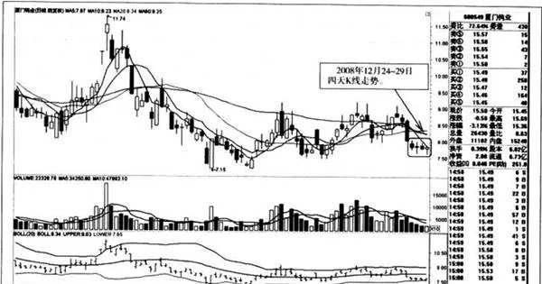 上图为2008年12月24 --29日厦门钨业的K线走势。大家从图中观察到该股经过两三个月的大幅下跌之后,股价走出了连续四天阴十字星、长十字星、倒T字线和红十字星等K线形态。而且,股价跌到布林通道的下轨线外。在这样一种特殊情况下,投资者可以考虑逢低“买入”,而不是“观望”,更不是“卖出”。到底这样的决策对不对呢?请大家继续观察。