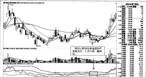 上图为2008年12月24至2009年1月27日厦门钨业的K线走势。股价已跌到布林通道的严重超卖区,股价受到技术上的有力支持,上升行情一触即发。果然,我们从图中观察到,厦门钨业股价从7.50元上升到10.90元,上升幅度超过40%,短线收益完全不亚于一波中级行情。
