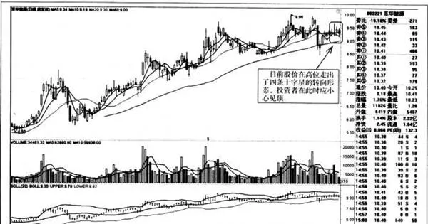 上图为2009年8月6一11日东华能源的K线走势。大家可以清楚地看到该股股价在高位正走出了四条十字星的转向形态,投资者在此时应小心见顶,“卖出”应该是最好的决策。