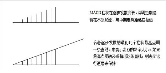 图中说明了标准的维持速率的柱状图是柱状长度在不断加长,且需要用表示速率的直线来判定。柱状的最高点的连线能维持在一条直线上,则表明速率在维持。相反则说明运行速率在降低,股价有回落的风险。