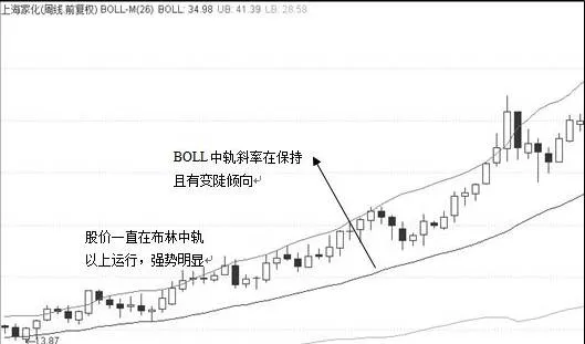 图中是在K线图中采用了主图叠加BOLL指标的方式,而布林通道中轨明显呈现出良好的上升态势,且斜率在逐步加大,说明股价运行速度稳定且在加快速度。另外股价一直运行在中轨以上,同样能说明股价强势,操作上可在判断出股价中长期运行速率在保持的同时介入,直到斜率降低为止离场。