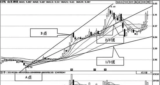如上图所示,山东钢铁(600022)。利用画线工具确定A点和B点的位置后,系统就会自动生成一组阻速线。