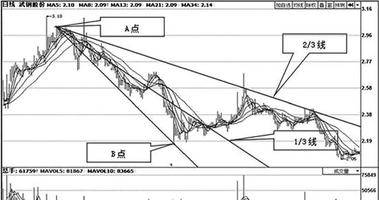 如上图所示,武钢股份(600005)。利用画线工具确定高点A和低点B的位置后,系统就会自动生成一组阻速线。