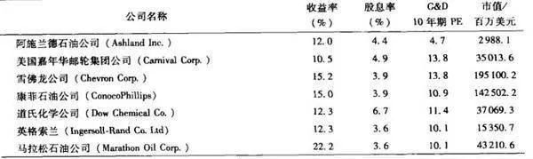 如果同时采用我们的“格林厄姆&多德市盈率”标准筛选(收益率至少达到AAA级债券收益的2倍,股息率至少为AAA级债券收益的2/39债务总额不超过有形资产账面价值的2/3),以及格林厄姆和多德建议的16倍长期市盈率上限,我们可以看到,在已经选定的股票中,哪些股票的盈利能力可能存在危机。