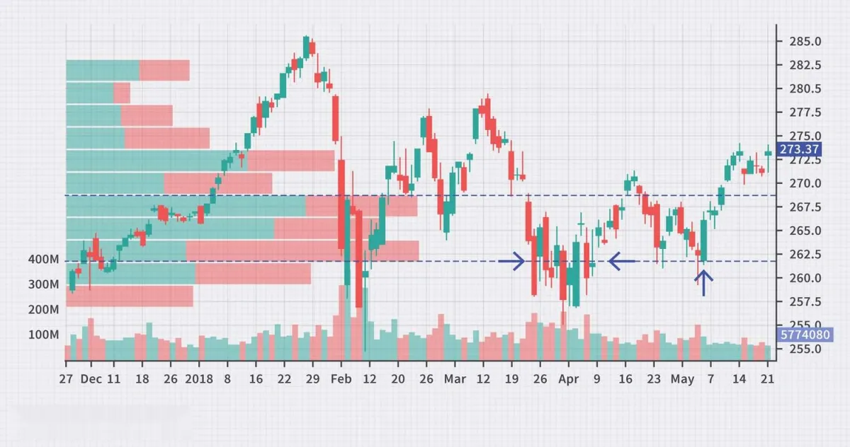 按成交量计价图表用于展示特定价格水平的买卖活跃度,这可以指示特定证券的支撑位和阻力位。通常情况下,证券价格在成交量较小的价格区间内波动时阻力较小,但在成交量较大的区域上下波动时则可能遇到困难。一些按成交量计价图表还会通过绿色或红色阴影来区分买卖成交量。这些信息对于将价格点明确地划分为强阻力位或强支撑位(而非一般价格水平)尤为有用。