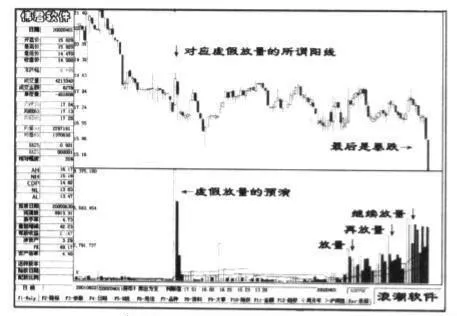 这个案例中有两次虚假的放量。前面一次只是持续了一天的阳线,第二天股价就被打回原地。第二次持续的时间相当长,有两个月之久,股价则在16.50元到17.80元之间波动,成交量经历了“放量”、“再放量”和“继续放量”三个阶段,而且量是越放越大。在第一次虚假放量前其日成交量不过几万股,虚假放量以后的日成交量也是以20万股以下为主,但到了后期的疯狂放量阶段每天的成交量居然超过500万股!