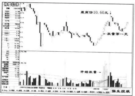 当然,股价是不可能一直无量上涨的, 等到了一定的高度,由于股价连续上涨的效应,买盘开始陆续进场。而短线获利筹码也开始增多,回吐的压力越来越大,这样成交量自然就开始放大,这是市场自然交易的结果。但如果仅凭此时成交量放大再追进去则风险明显加大,以下的案例充分说明这一点。