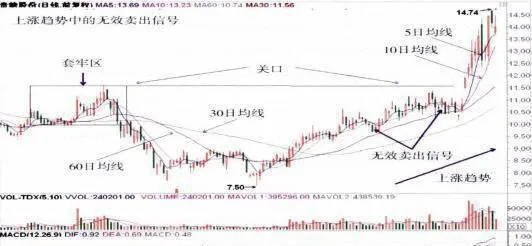 上涨趋势中,随着证券价格的上升,市场的惜售心理越来越大,造成市场的成交无法活跃,主力使用很少的资金,就可以大幅度推高股价,但是短线客的存在,会大大阻碍主力的操盘计划,为了在上升途中,清洗短线客,主力会在适当的时机停止买入,任凭散户自由换手。由于没有了主力的控盘,抛压会越来越大,从面使得价格回落,当价格跌破某一币要支撑位后,短期均线系统就发出了卖出信号,这个时候,主力会及时出手护盘,避免价格大幅跌落,被散户抄底,从面形成逆转之势。由于价格迅速回升,致使已经发出卖出信号的均线也出现逆转,这样就形成了无效的卖出信号(注:从发出买入信号当日计算,上涨达到三个交易日则视为有效信号,上涨少于三个交易规则视为无效信号)(如图6-15、图6-16所示)。