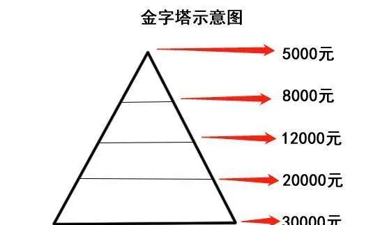 金字塔买卖法指的是在买进股票的时候先用少量的资金买入,如果买进以后股票市场是持续下跌的一个状态就投入更多的资金,总体买进的过程就像是金字塔一样,如下图所示: