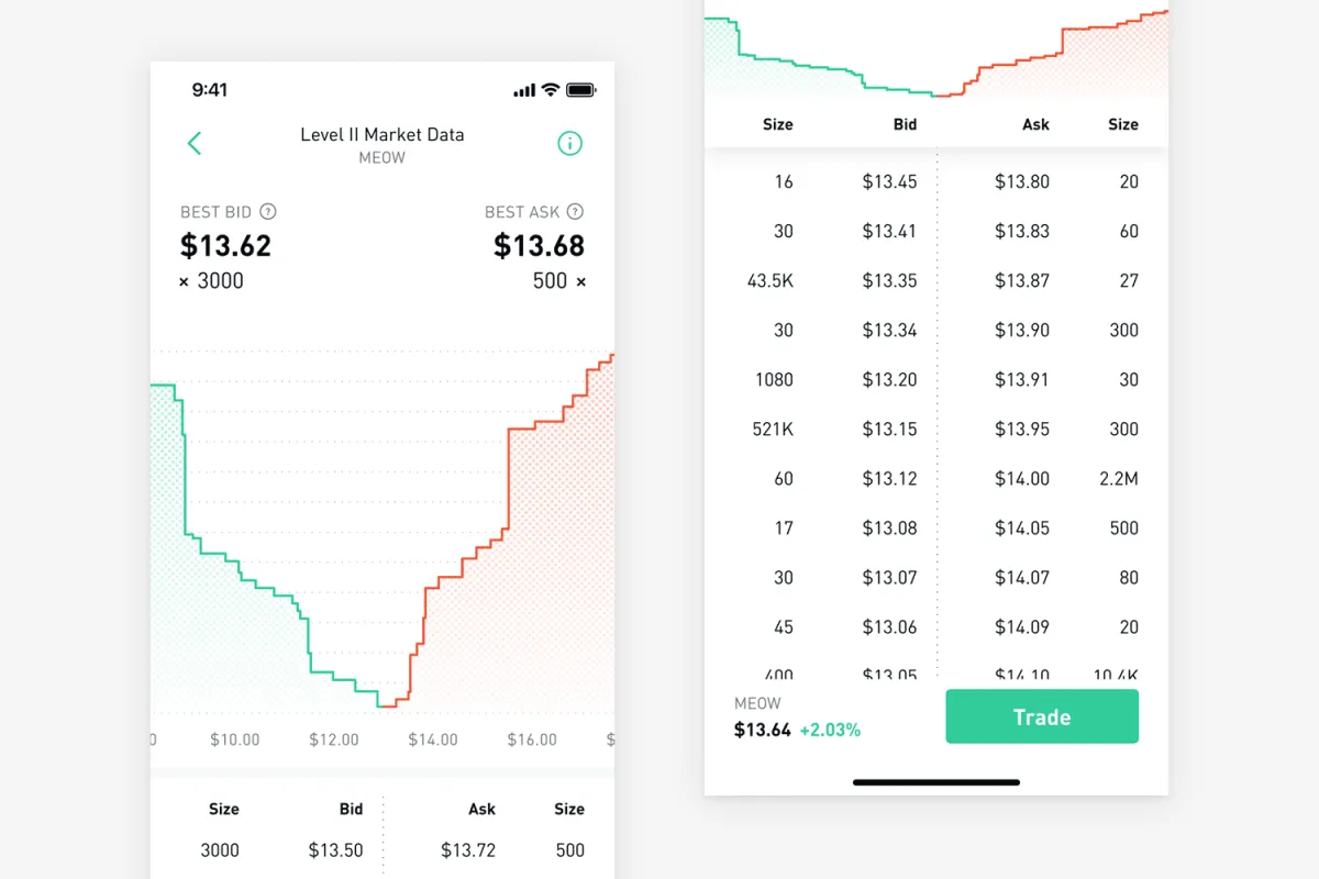 目前MEOW股票的报价为每股13.62美元至13.68美元,买入量为3000股,卖出量为500股。右侧面板显示了左侧面板的买入深度。如果所有3000股均以每股13.62美元的价格售出,则下一个最佳买入价为每股13.45美元,但仅能卖出16股。