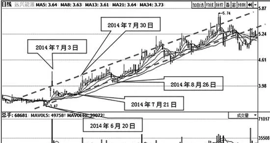 接着按照平行线的画法,绘制上升通道的上轨线。由于2014年7月3日的K线过于特殊,我们以7月30日的高点为基点绘制上升通道的上轨。以该点为基点画平行线,通过该平行线的高点要尽可能多,只有7月3日的K线位于通道线外。