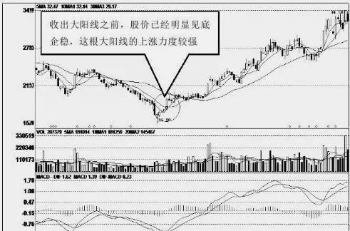 从图中可以看出,在大阳线出现之前的几天里,盘面上呈现小阴小阳走势,说明股价的下跌力度已经衰竭。特别是出现大阳线的前一天,一根中阳线已经将前面7根小阴小阳线踩在脚下,显示市场已经出现止跌回升态势。这时一根大阳线乘胜而上,则进一步加强了市场多头气势。在大阳线出现之前的一段时间里,成交量极度低迷,说明市场抛压已经很轻,而产生大阳线时成交量温和放大,说明上涨得到了市场的积极响应。
