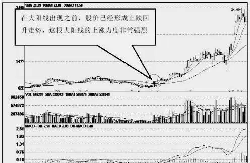 股价经过持续的下跌调整后,做空能量释放结束,股价出现明显的企稳走势,市场重心渐渐上移,表现出强烈的上涨欲望。此时如果拉出一根大阳线,则表明市场底部成功确立,后市将出现强劲的上涨行情。