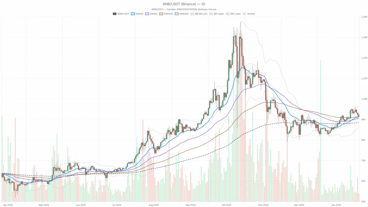 今天, BNB(BNBUSDT货币对)的价格走势与强劲市场在上涨行情后常见的走势一致:价格并未暴跌,而是放缓并释放压力,在910-920美元附近的均衡区间内波动。日线图显示,主要趋势依然是上升趋势,但日内时间框架已开始显现动能降温的明显迹象。