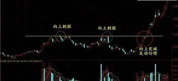 在实盘中,向上突破的前主力通常会向上进行多次的试探,在K线的形态上会形成刺探的形态。看下图