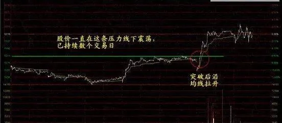 分时图中,观察股价走势持续多日的情况下在某条压力线下进行窄幅的震荡运行,成交量呈现极度的萎缩。某日的股价会伴随成交量的放大突破以后再沿着均线进行拉升,在突破后的回踩时就是经典突破买入形态中较好的买点。