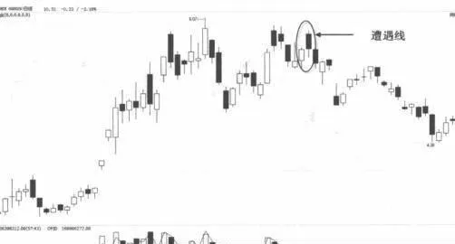 当股价连续上涨后,突然在某天开盘时高开,然后逐波下跌,最后在前一上涨日的收盘位收盘,就像当头棒喝一样狙击了上涨的趋势,从而转为下跌趋势,那么这两天的K线就被叫作遭遇线,如图1。当出现该K线组合后,股民就该考虑卖出操作了。