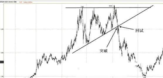 注意第三个峰顶,在上边之上股价有一个高开低走的长阴,高开创出8,03元的新高,但瞬间回落至边的下方,我们将其视为价突破,因为整体形态仍符合上升三角形的判断。在做趋势线的时候找们也经常会遇到类但的毛刺,是否需要加以修正,就要看技术修为和对市场理解而定。突破后的下跌辐度超出了理论测算目标。